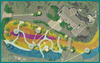 This project began with the home owner’s desire to improve the appearance of an existing detention basin which occupied most of the front yard. By re-