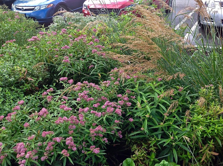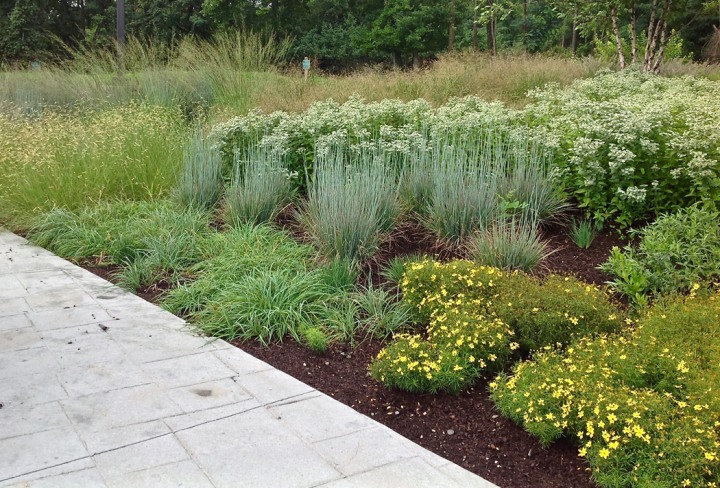 Installed in the fall of 2014, the campus at this orthopedic institute in Flemington, NJ features a waterfall, seating area, parking islands and infiltration basins. Plants consist mostly of native species. This site is very heavily populated with deer.