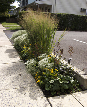 A small garden space between a parking lot and street makes for a tough place. This native garden provides year round color and texture, utilizing plants tolerant of drought and urban soils. This is a tough-guy garden: no need for irrigation, staking, fussing, or fertilizing. We just leave it alone and pull the few weeds that manage to edge in here and there. This plant palette will work in similar areas where soil is compacted and/or lacking in organic matter and where the only water source is rain. DOWNLOAD