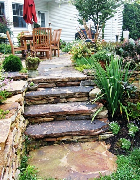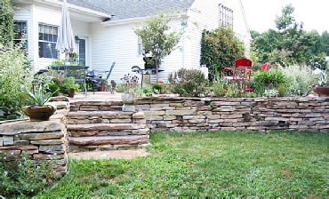 This residence features a stone patio surrounded by attractive plantings. The central tree will grow to provide ample shade during summer.